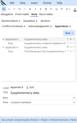 We can insert sections and paragraphs anywhere in the Body by clicking on the New tab. We can insert through either the field entry in the Left Panel under Sections tab or directly in the main editor. When we insert new sections and paragraph , the counters in the Article will also change accordingly.